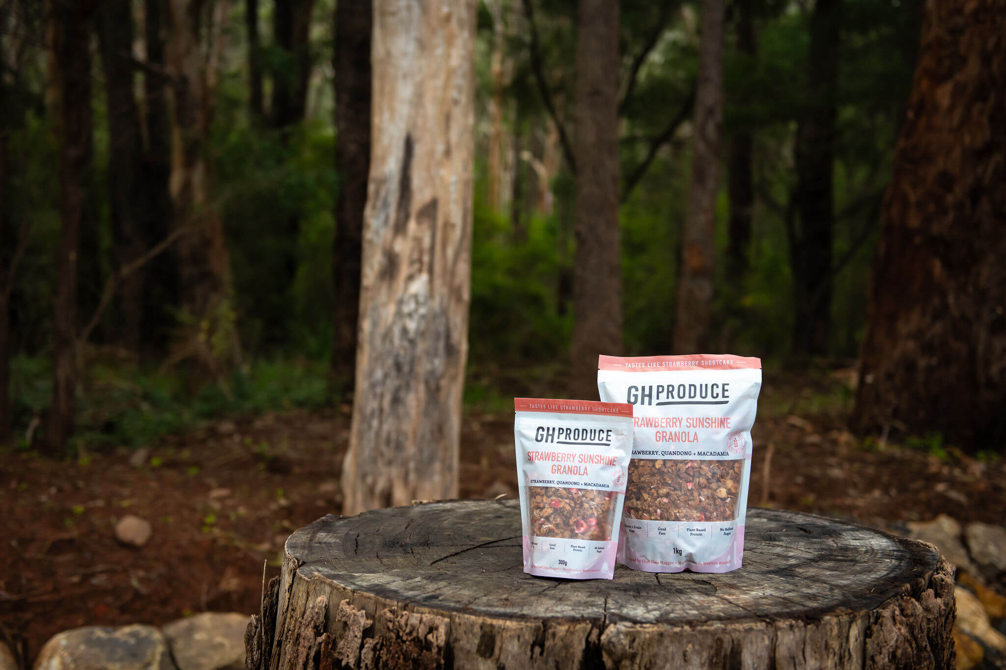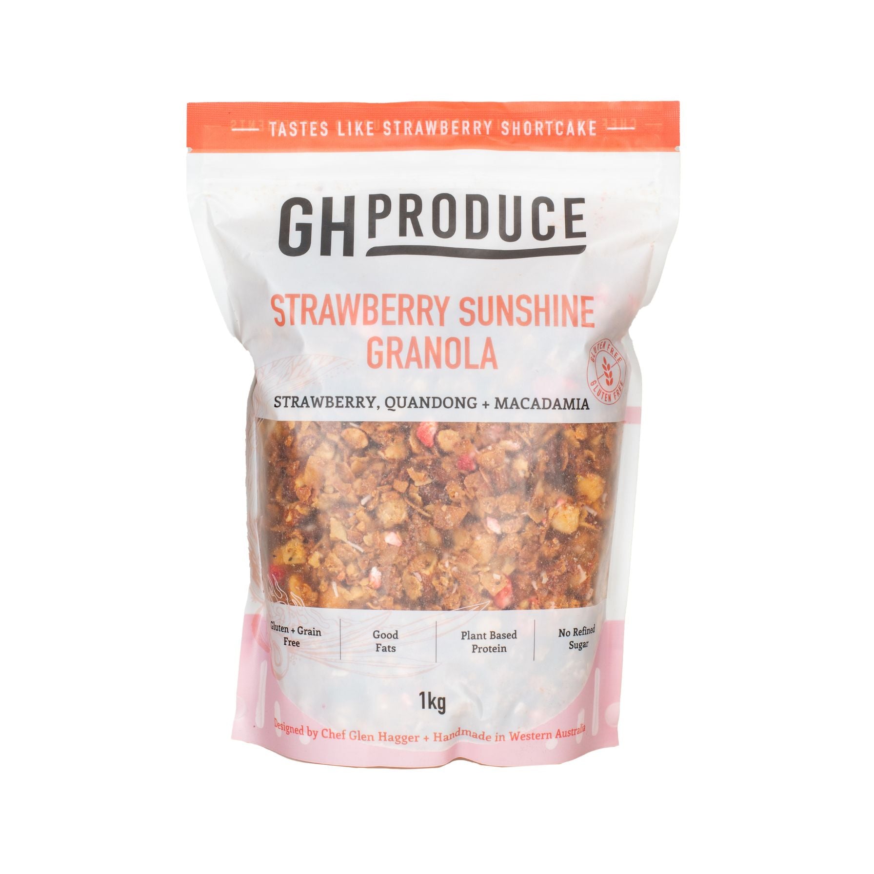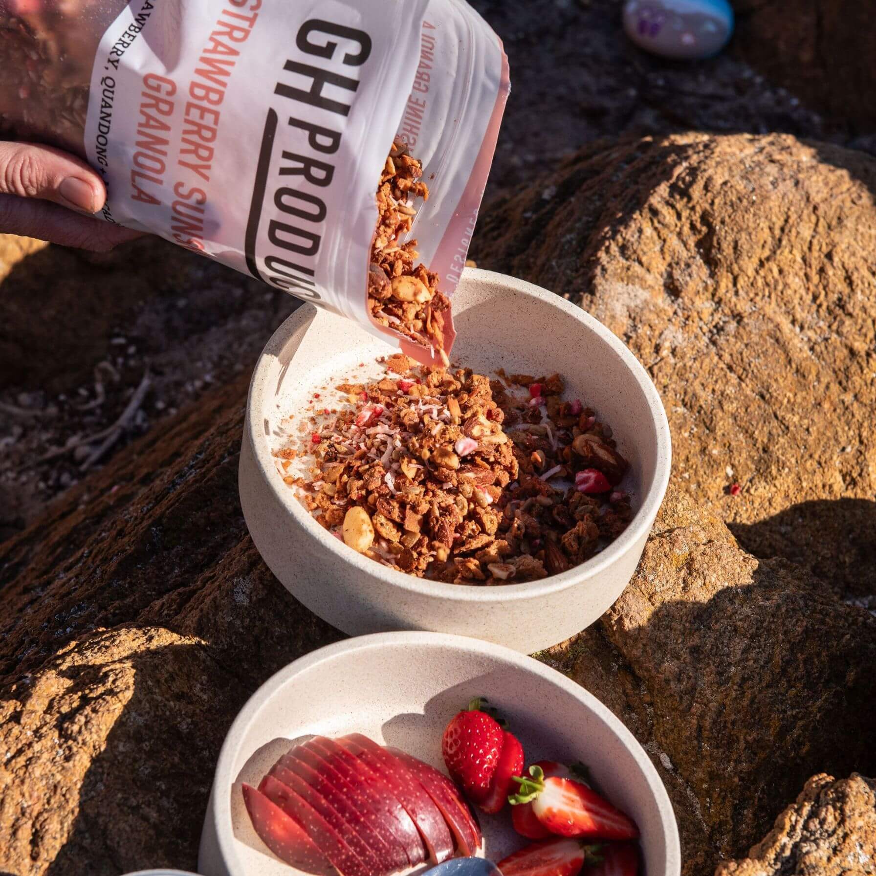 Our Strawberry Sunshine is like taking a bite of strawberry shortcake, but healthier! Packed full of sweet, freeze-dried strawberries from Albany, creamy macadamias, roasted almonds, toasted coconut, and a tangy kick from native WA quandong, this crunchy granola is so good it is now permanently part of the GH range!